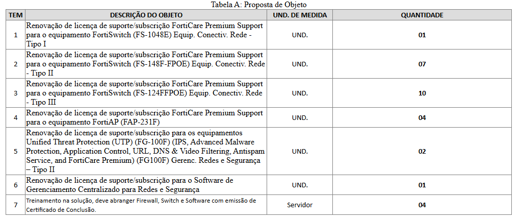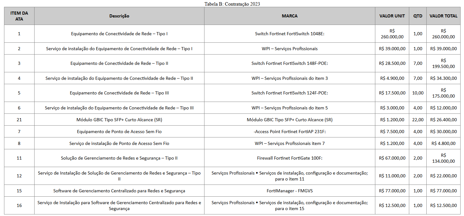 Deve declarar está ciente da "Tabela B: Contratação 2023" sendo que sua entrega deve prever serviço de instalação e migração das configurações bem como todos os Módulos GBICS listados e cabos SFP necessários para conexão.