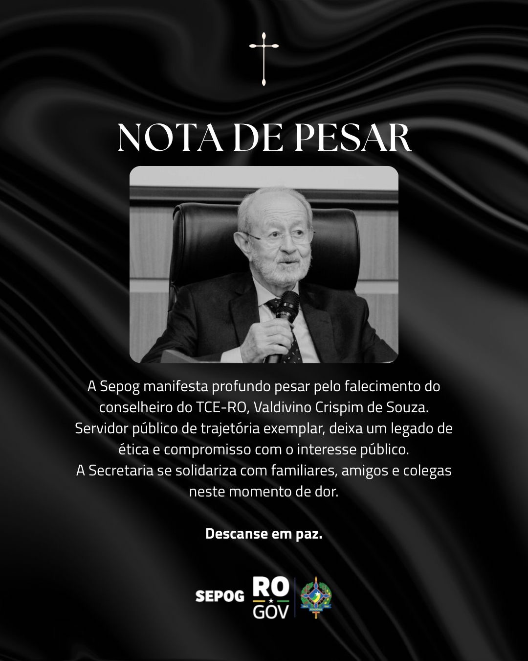 A Secretaria de Planejamento, Orçamento e Gestão (Sepog) manifesta profundo pesar pelo falecimento do conselheiro do Tribunal de Contas do Estado de Rondônia, Valdivino Crispim de Souza.